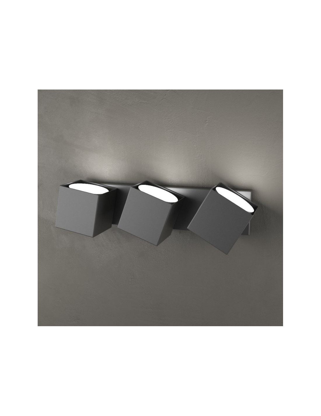 ROTATION é una lampada da parete del brand italiano Top Light, realizzata con 3 diffusori a forma di cubo in metallo, verniciato grigio antracite, roteanti a 360° che permettono di orientare la luce in tutte le direzioni semplicemente modificandola all’occorrenza.