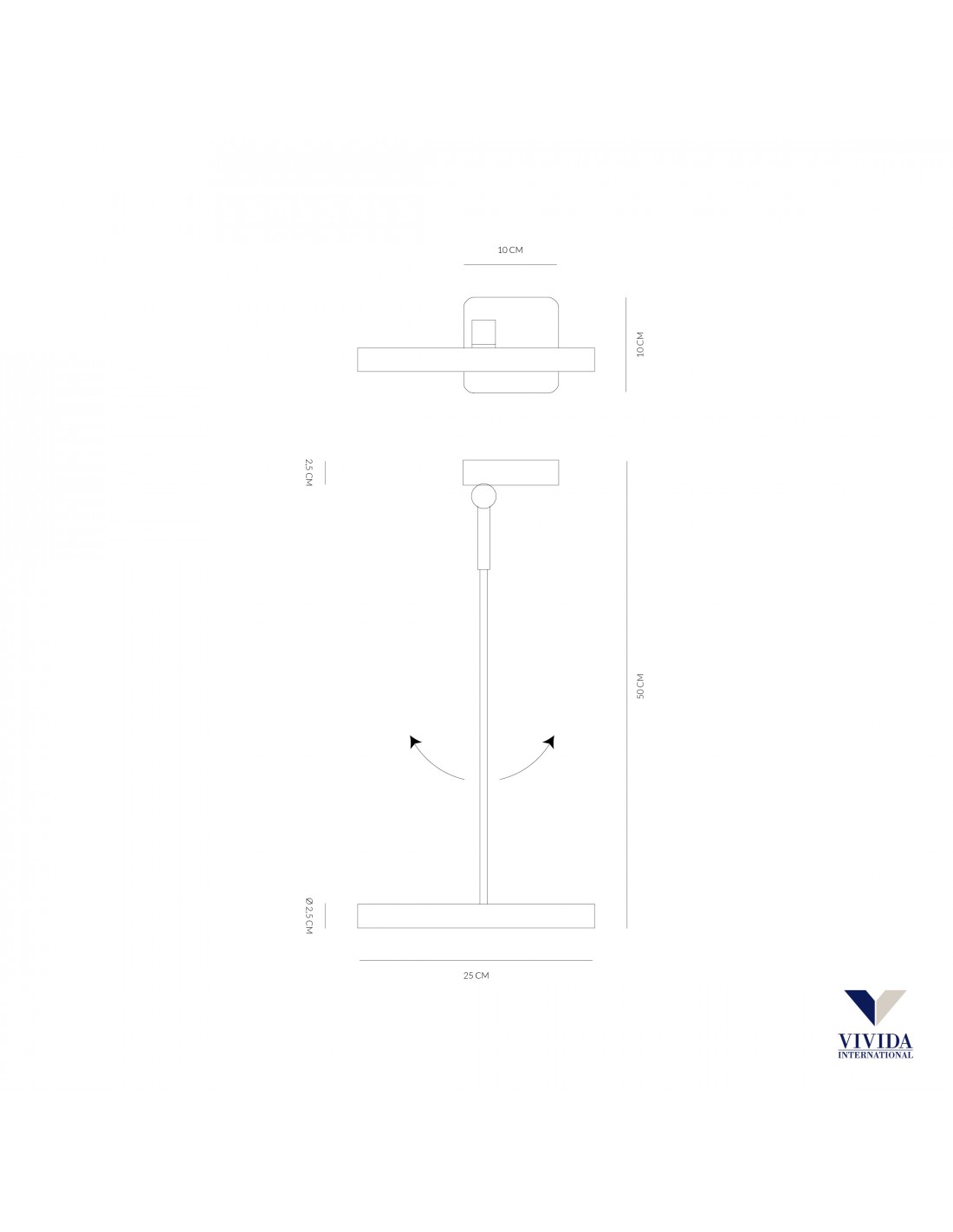 L’applique CIAK del marchio VIVIDA INTERNATIONAL presenta una struttura realizzata in alluminio finitura nero, con piastra quadrata a parete, braccio orientabile con spot cilindrico.
