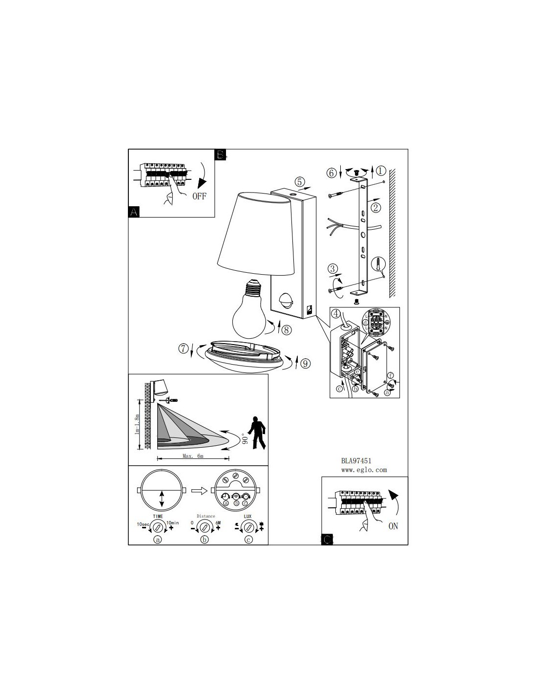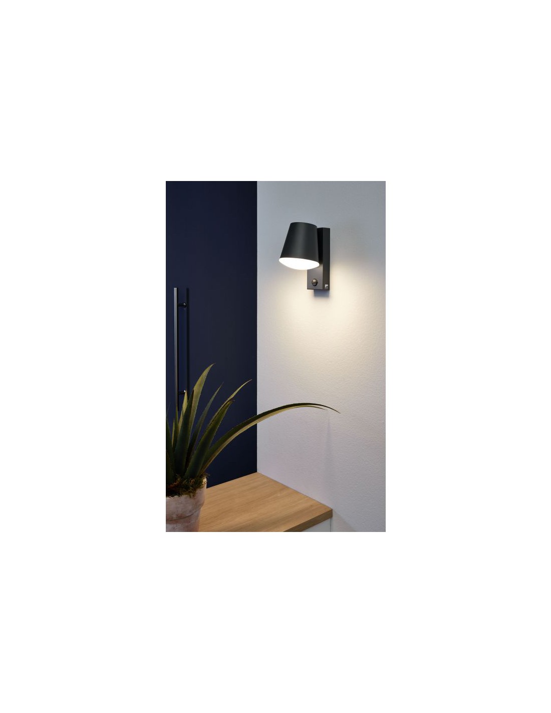 L’applique da parete CALDIERO del brand Eglo presenta una struttura in metallo zincato di colore antracite e diffusore in policarbonato bianco, rivolto verso il basso. Sensore di movimento integrato.