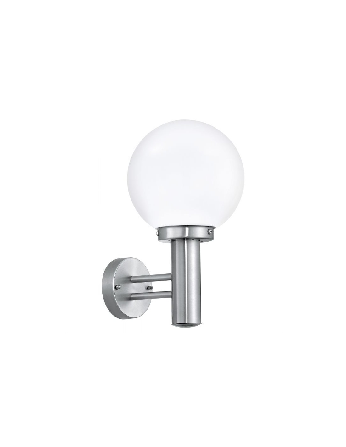 La lampada da parete NISIA del brand EGLO presenta una struttura in acciaio inox spazzolato e diffusore a forma di sfera in vetro bianco satinato, rivolto verso l’alto.