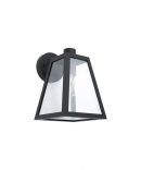 La lampada applique da esterno MIRANDOLA del brand EGLO presenta una struttura in alluminio nero e diffusore a forma di lanterna in vetro chiaro, rivolto verso il basso.