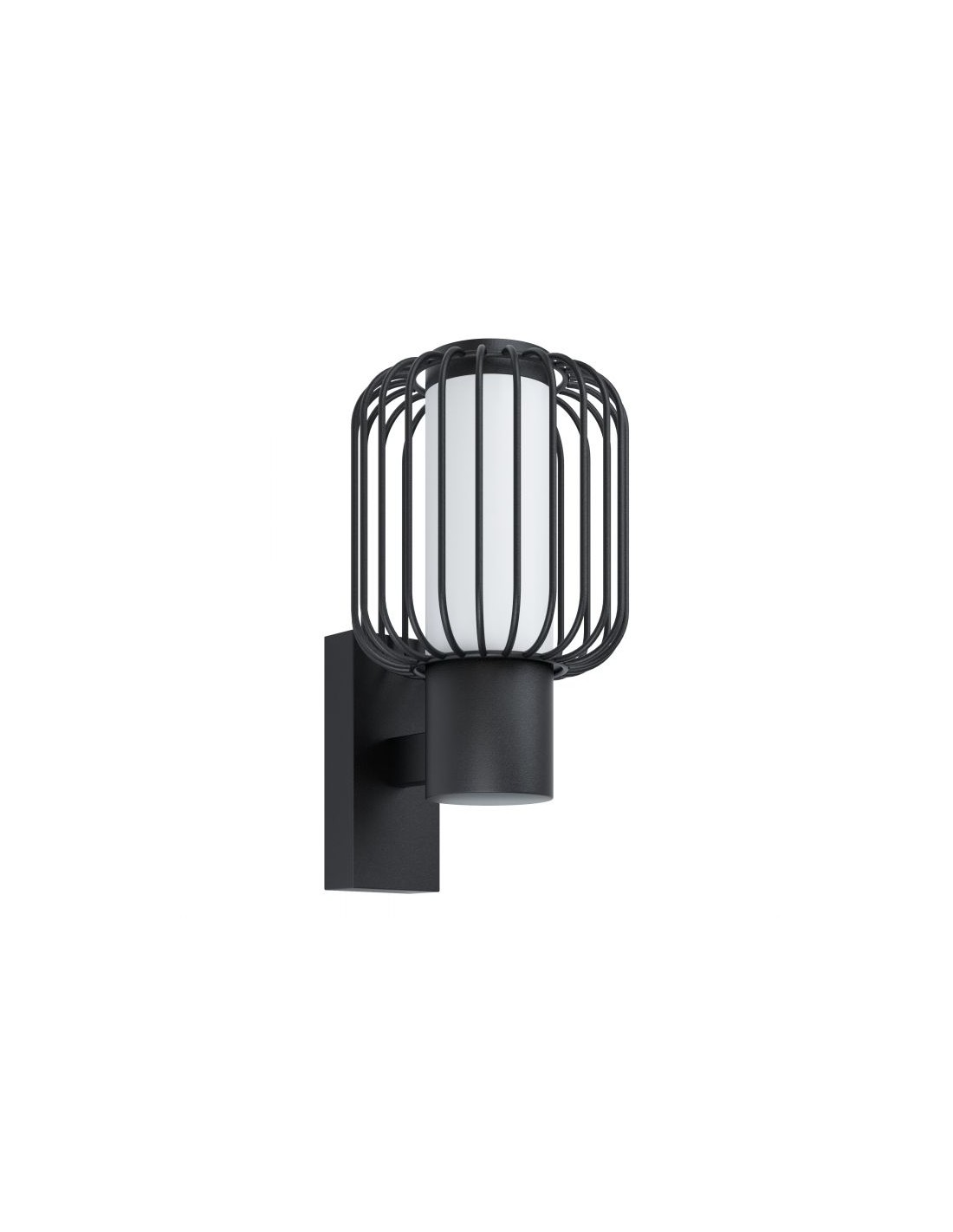 La lampada applique da esterno RAVELLO del brand EGLO presenta una struttura in metallo zincato nero e diffusore cilindrico in policarbonato bianco rinchiuso in una rete metallica in tinta con la montatura.