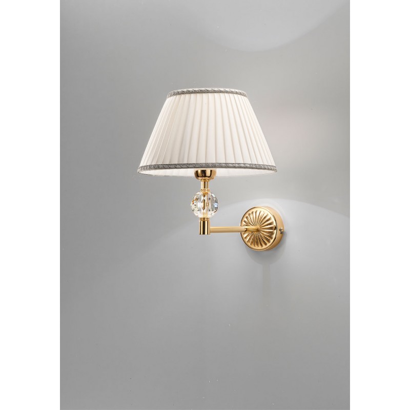 • Questa lampada da parete è realizzata in ottone metallo dorato 24k con sfera di cristallo molato. Paralume in tessuto pongé fasciato color panna.
