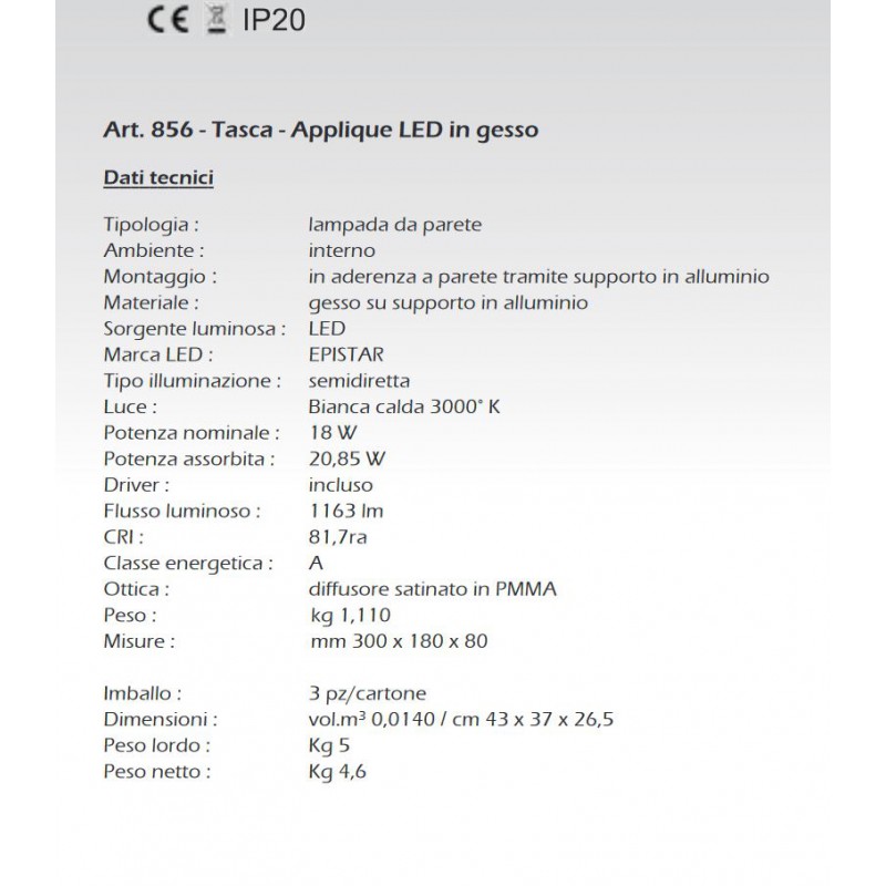 Applique In Gesso Verniciabile Led 18w Tasca Isyluce 856
