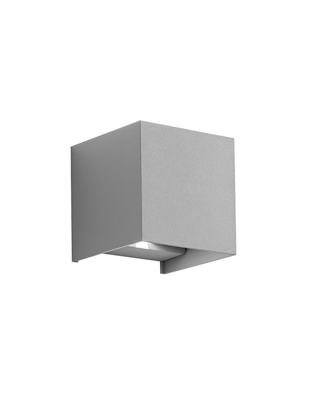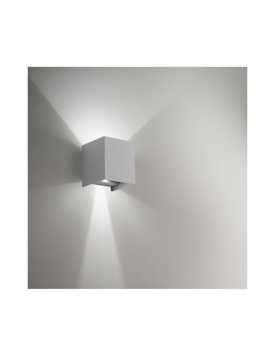 Applique biemissione a forma di cubo del brand Gea Led, realizzato interamente in alluminio pressofuso con diffusore in vetro trasparente.