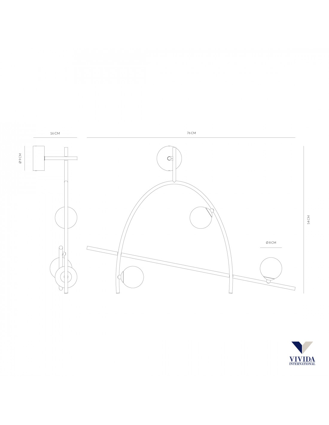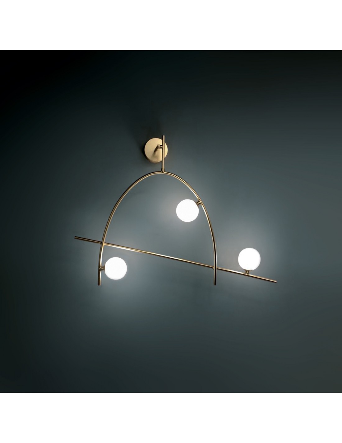 L’applique FREEDOM del marchio VIVIDA INTERNATIONAL presenta una struttura in acciaio finitura oro con diffusori sferici in vetro bianco.