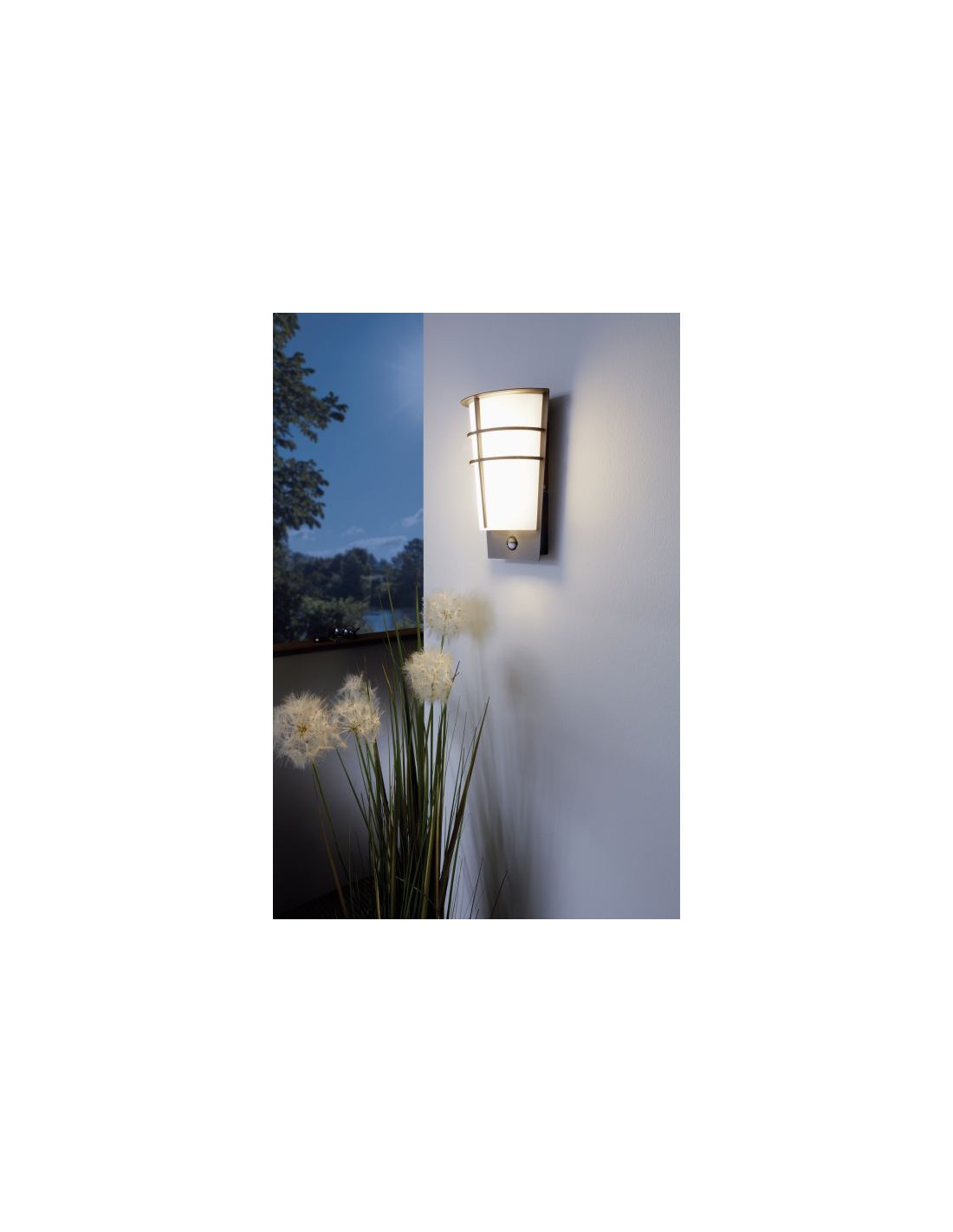 La lampada da parete BREGANZO del brand Eglo presenta una struttura in metallo zincato colore antracite e diffusore in policarbonato bianco. Sensore di movimento integrato.