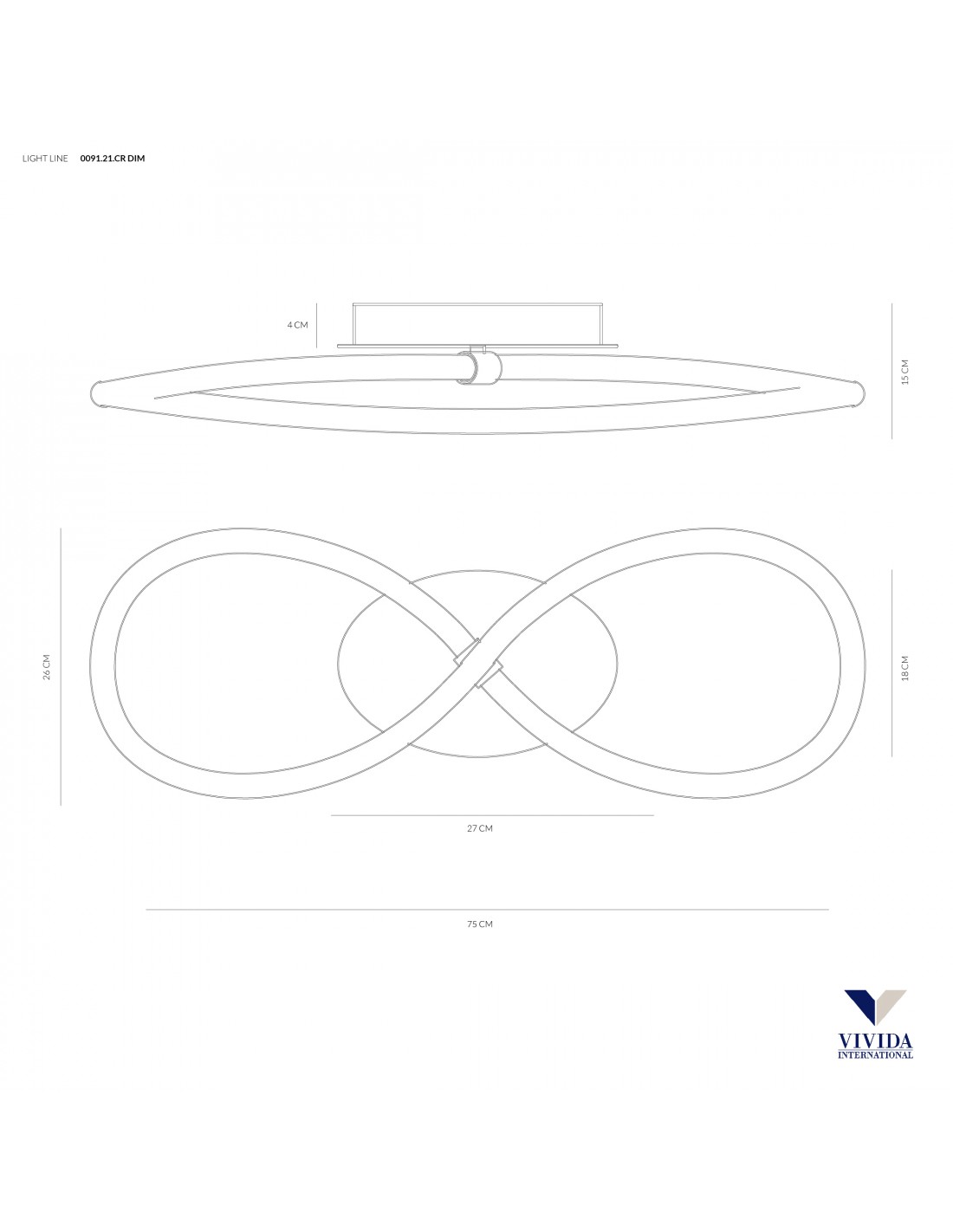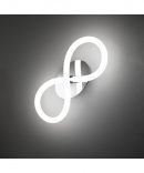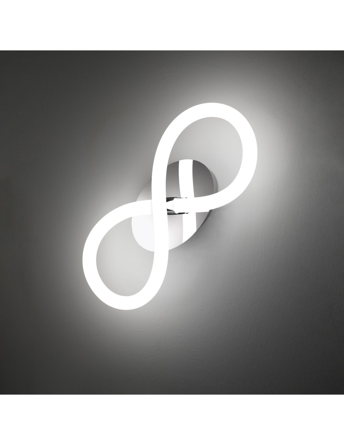 Questa applique è formata da una montatura in metallo finitura cromo con piastra rotonda e diffusore cilindrico in acrilico bianco che richiama la forma di un infinito.