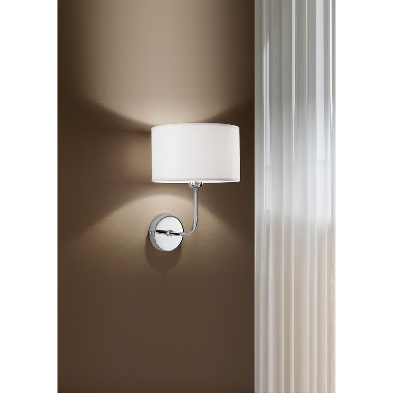 • Questa lampada da parete é realizzata con struttura in metallocromo lucido e paralume in tessuto ignifugo teletta bianca.