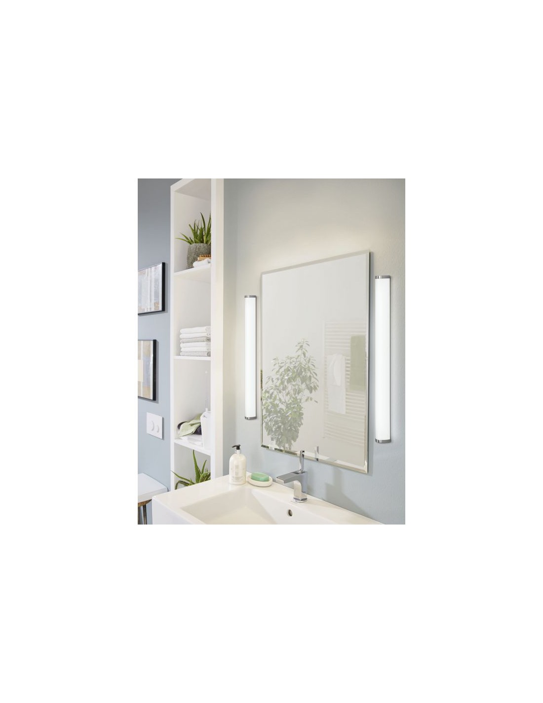 L’applique da specchio GITA del brand EGLO presenta una montatura lineare in lega metallica di colore cromo e diffusore in policarbonato bianco.