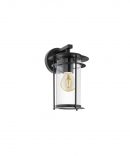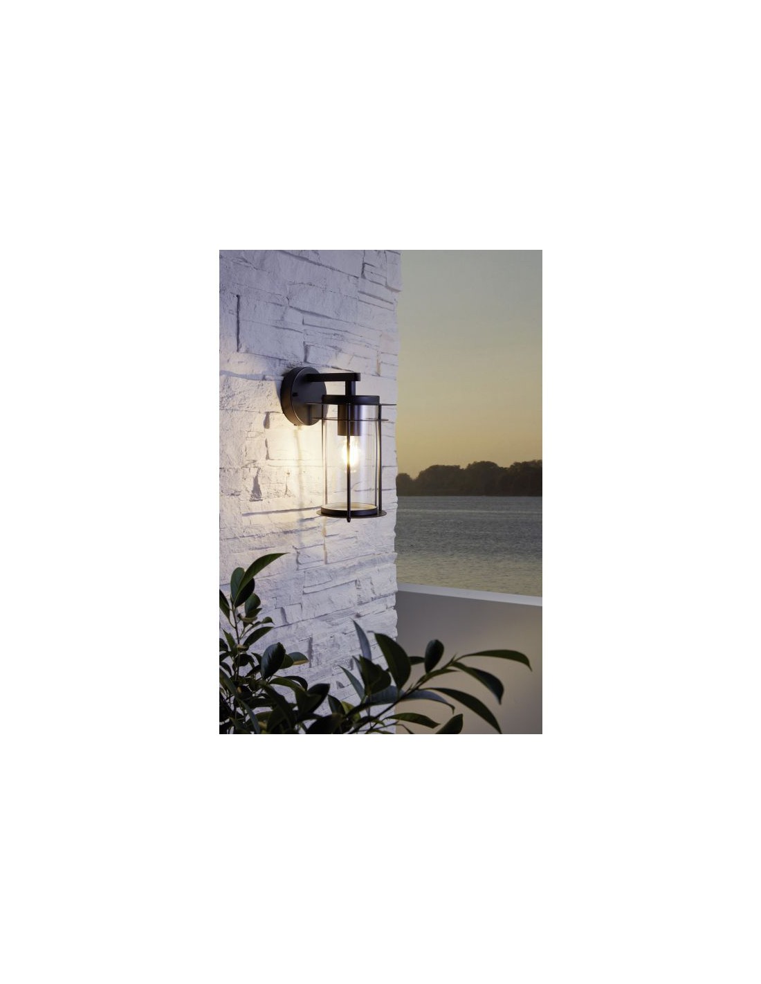 La lampada da parete VALDEO del brand Eglo presenta una struttura cilindrica in metallo zincato di colore nero che ricorda l’idea di una lanterna con diffusore in vetro trasparente rivolto verso il basso.