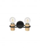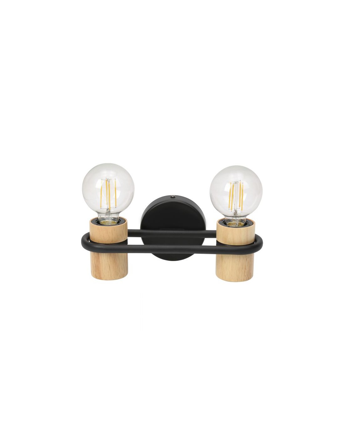 La lampada da parete CHIEVELEY presenta una montatura in metallo nero con piastra rotonda e 2 portalampada ai lati dalla forma cilindrica in legno marrone.
