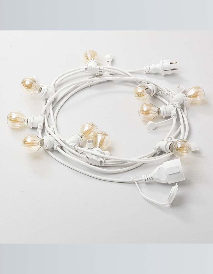 Catena luminosa da esterno del brand Gea Led composta da cavo elettrico resistente in gomma di colore bianco con sezione 2x1mm e lunghezza 10 metri, totalmente impermeabile con un grado di protezione IP44, prolungabile da entrambi i lati con altre catene fino al raggiungimento della lunghezza desiderata.
