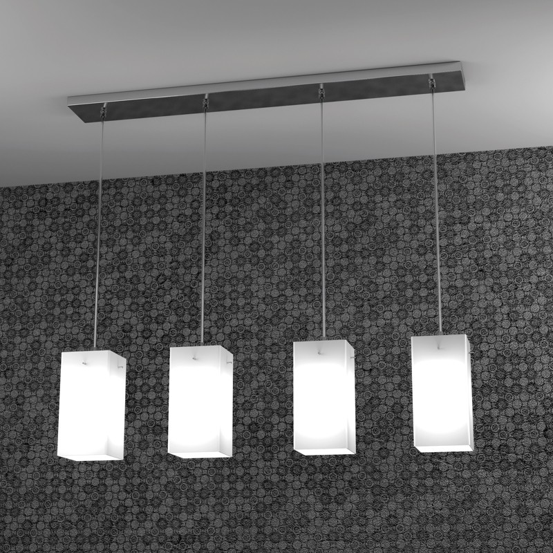 Costruita in metallo cromato con diffusori montati in serie in vetro bianco soffiato e acidato di forma quadrata.