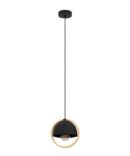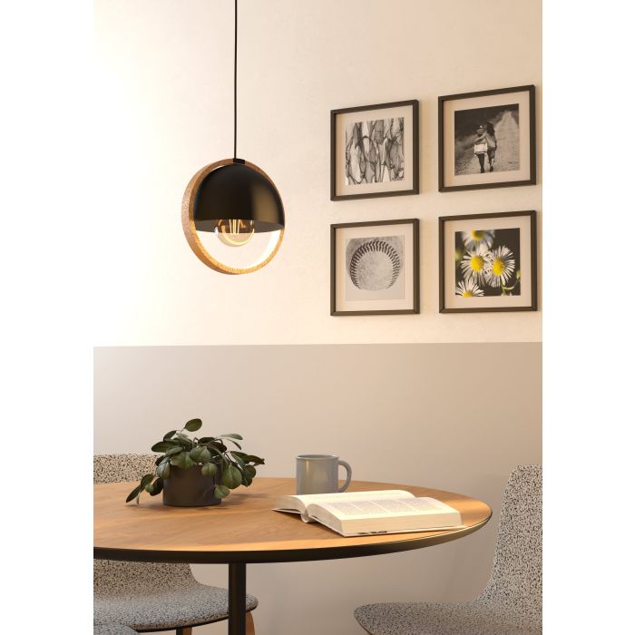 La luce a sospensione CALLOW, realizzata con un paralume rotondo in metallo nero, con un anello di legno tutto intorno. Il particolare design di questa lampada è ideale per interni dallo stile moderno o scandinavo. É ideale per illuminare il tavolo da pranzo o il comodino in camera da letto. La lampadina non è inclusa nella confezione. Per la lampada è adatta qualsiasi lampadina con attacco E27.
