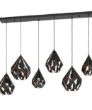 Sospensione CARLTON con struttura in metallo nero e legno marrone, H. 107 e L. 145,5 cm a sei luci. Il moderno lampadario dal design minimalista si adatta perfettamente ad arredi essenziali grazie al mix di materiali di tendenza, come il legno e il metallo. Le lampadine a filamento con attacco E27 presenti nell’immagine non sono incluse nella consegna.