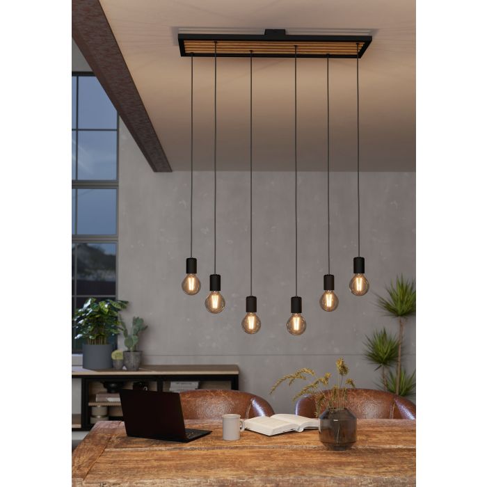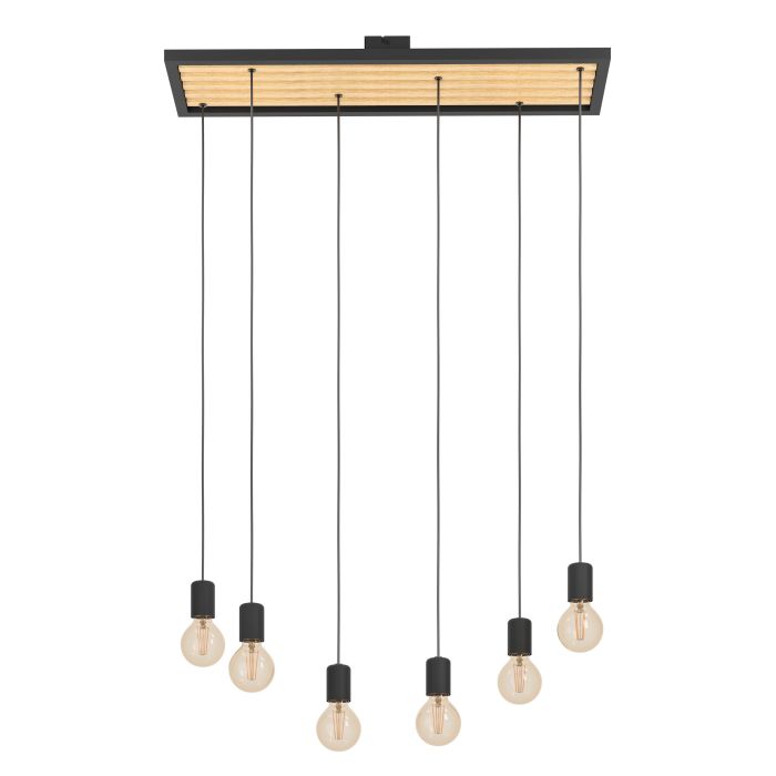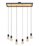 La lampada a sospensione CONSETT è composta da una base con una cornice nera rettangolare e listelli longitudinali in legno di ficus. La base è corredata da sei sospensioni in metallo nero disposte ad altezze differenti. L’altezza di ciascuno può essere regolata. Questo lampadario ha un design nature e minimalista che si armonizza con molti stili di arredamento grazie alla possibilità di utilizzare le lampadine che si preferiscono. Con una larghezza di 78 cm, è un elemento di particolare attrazione per la sala da pranzo. Le lampadine a filamento presenti nell’immagine non sono incluse. Può essere utilizzata qualsiasi lampadina con attacco E27.