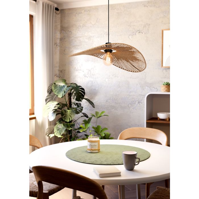 Sopspensione SIRUELA composta da una struttura in alluminio e diffusore in carta intrecciata.. Il paralume crea un intrigante gioco di luci e ombre quando la luce è accesa. Questa lampada si armonizza perfettamente con tendenze quali nature, stile scandinavo e boho creando una piacevole atmosfera grazie ai suoi materiali naturali. Offre un’illuminazione confortevole per qualsiasi ambiente, che sia in soggiorno, in camera da letto o cucina. La lampadina a filamento presente nell’immagine non è inclusa nella consegna. Per la lampada è adatta qualsiasi lampadina con attacco E27..