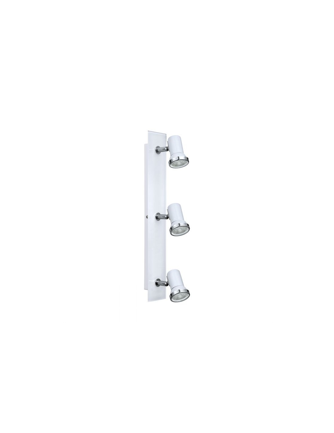 Il faretto spot TAMARA del brand EGLO presenta una struttura in metallo bianco rettangolare con 3 faretti spot cilindrici in tinta con la struttura e diffusore in vetro. Inserto cromo sul bordo del faretto.