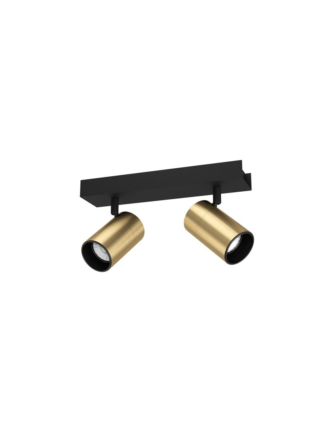 La lampada CUMARIBO del brand EGLO presenta una struttura in metallo con piastra a soffitto nera e doppio spot orientabile di colore ottone.