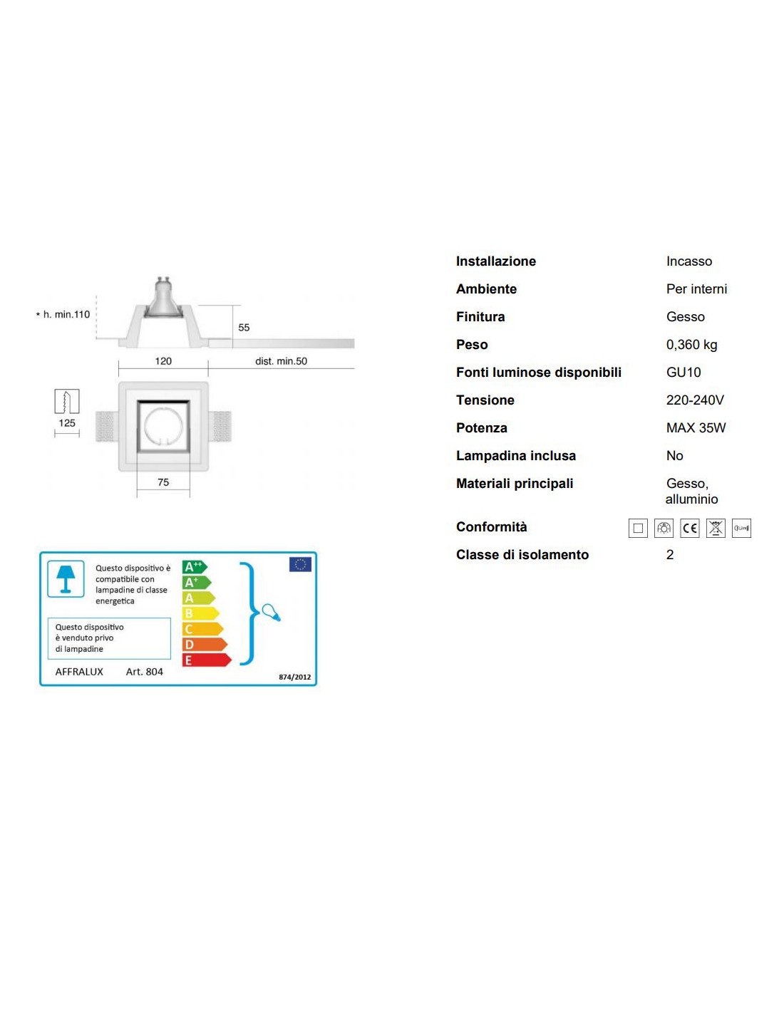 - Lampadine: 1 x GU10 max 35w Led – Alogena (non inclusa)