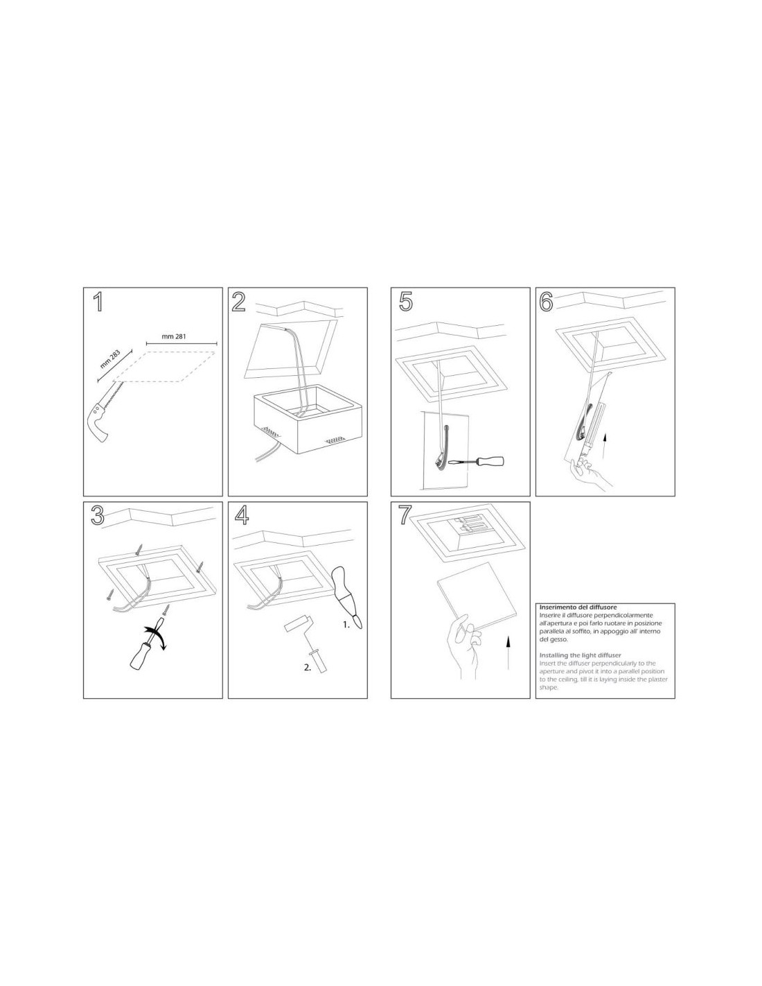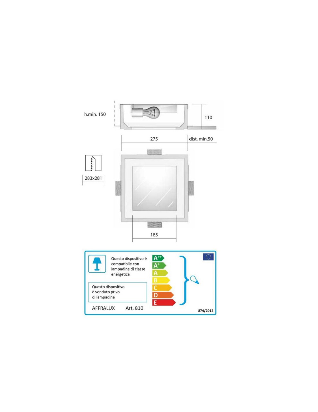 La struttura è quadrata con diffusore in PMMA e staffe in alluminio incorporate per facilitarne l’installazione nei contro soffitti in cartongesso da mm 9 a mm 18.