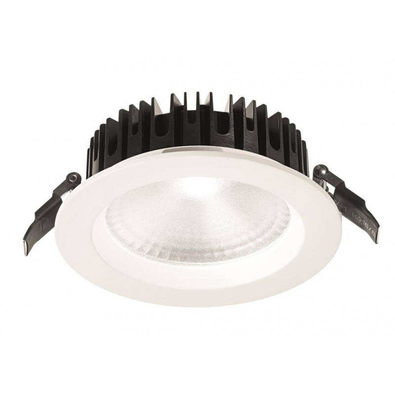 Struttura e dissipatore realizzati interamente in alluminio con finitura bianco opaco, e diffusore in vetro antiabbagliamento.