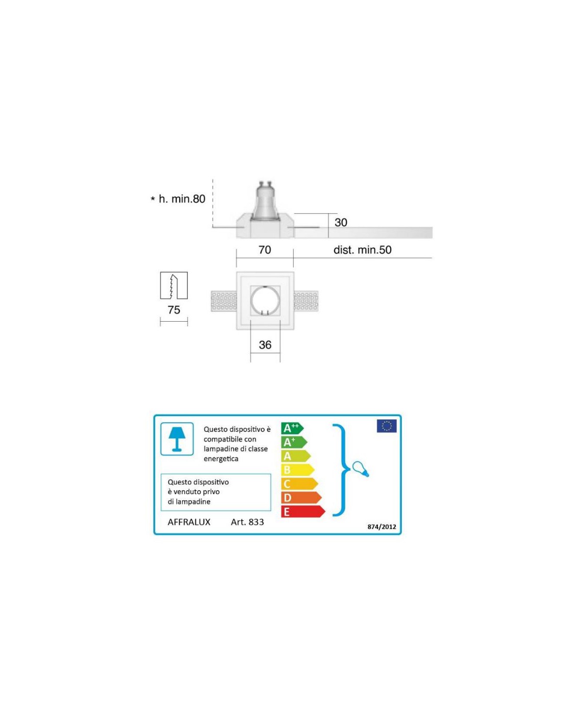 - Lampadine: 1 x GU10 Ø3,5mm Led max 4,5w (non inclusa)