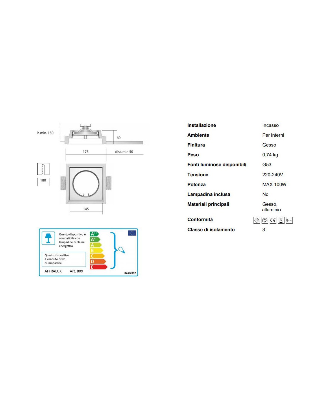 - Lampadine: 1 x G53 100W (non inclusa)