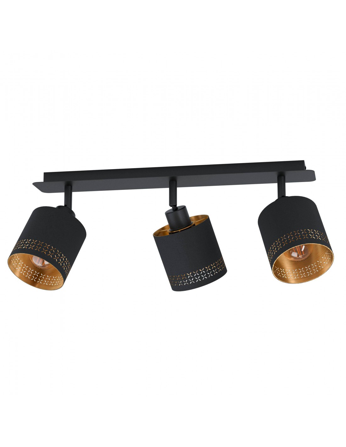Il faretto ESTEPERRA del brand EGLO presenta una struttura rettangolare in metallo finitura nero e 3 spot cilindrici orientabili in tessuto incamiciato decorati internamente foglia oro.