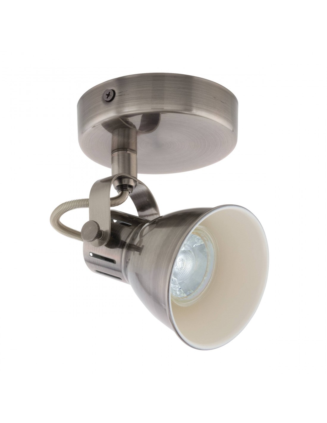Il faretto spot SERAS del brand EGLO presenta una struttura in metallo verniciato nichel anticato con spot orientabile verniciato internamente di colore beige.
