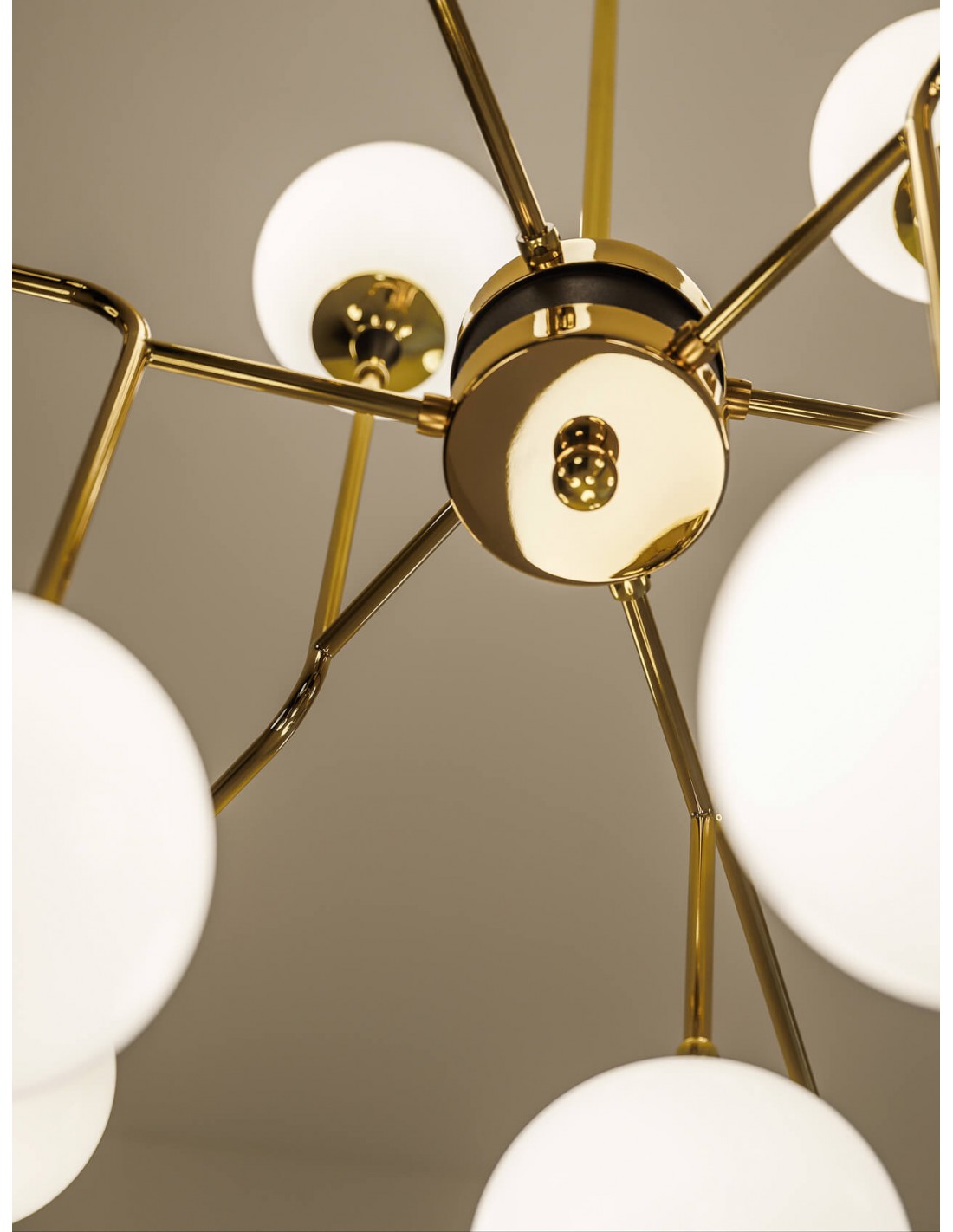 Un lampadario altamente sofisticato che mantiene il fascino degli anni Cinquanta grazie all’abbinamento tra l’ottone e la doratura galvanica della struttura e le sfere in vetro bianco.