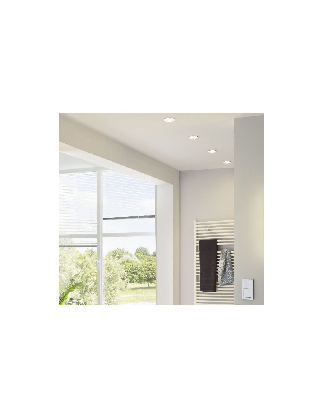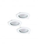 Il kit PENETO del brand EGLO è composto da 3 faretti da incassi rotondi realizzati in metallo bianco, ideali per controsoffitti in cartongesso.