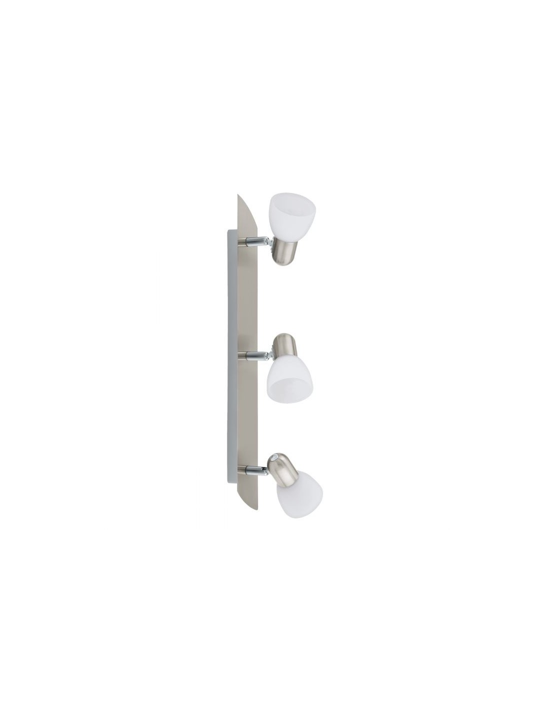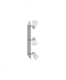 La lampada ENEA presenta una piastra rettangolare in metallo nichel opaco e 3 faretti spot orientabili. I diffusori sono in vetro satinato bianco orientabili.