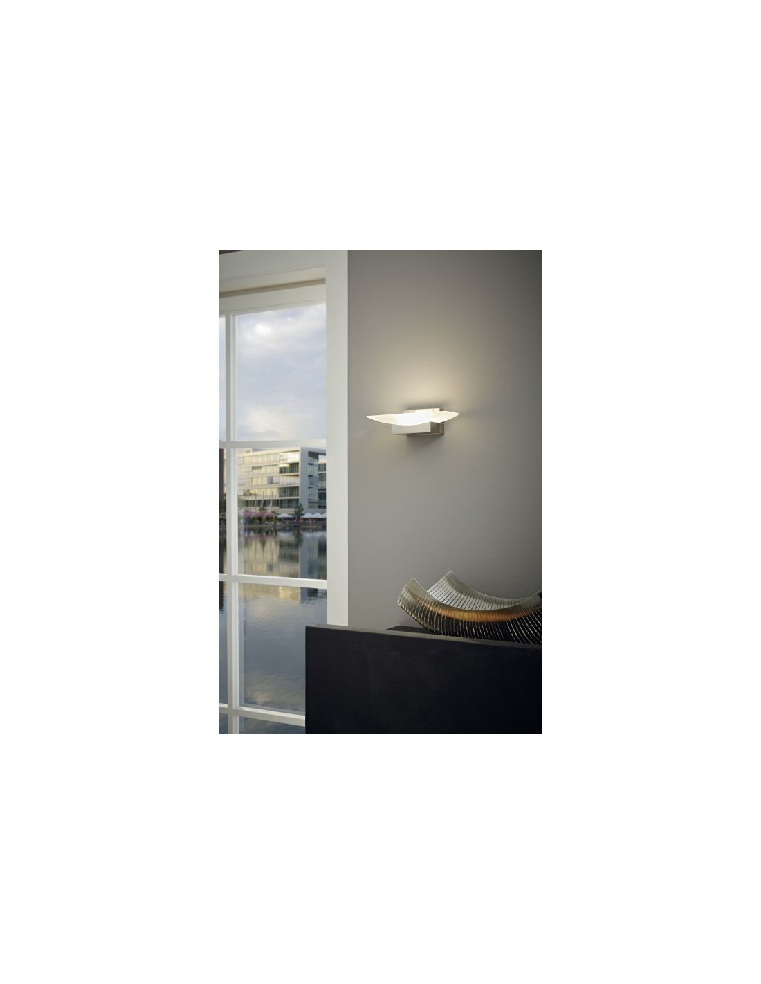 L’applique da parete METRASS del brand Eglo è una lampada realizzata in alluminio bianco e diffusore in policarbonato satinato rivolto verso l’alto.