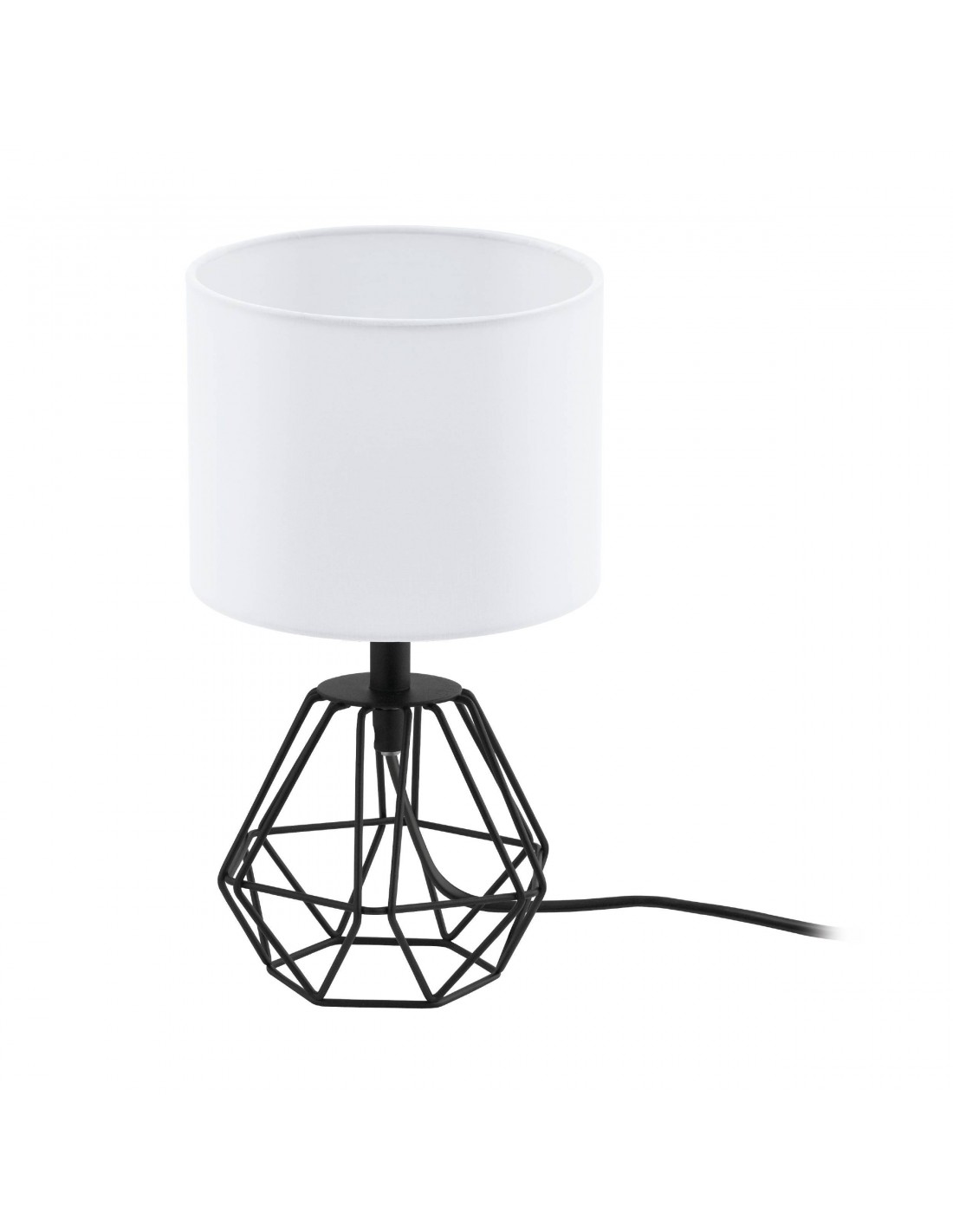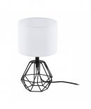 La lampada da tavolo CARLTON del brand EGLO presenta una base metallica a gabbia sfaccettata finitura nero e paralume cilindrico in tessuto interamente bianco.