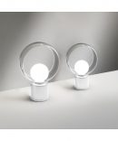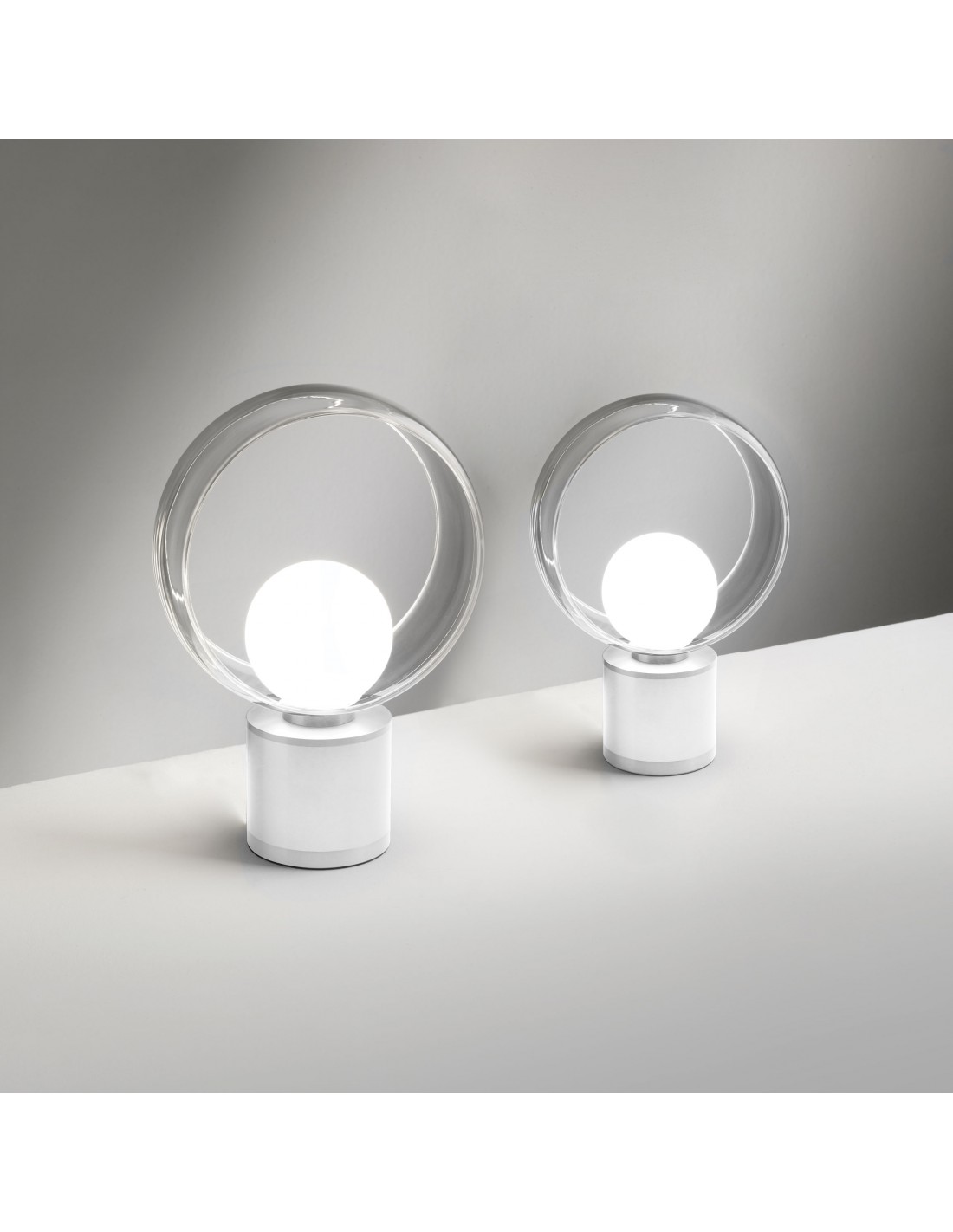 La lampada da tavolo COSMIT del marchio VIVIDA INTERNATIONAL presenta una struttura in alluminio finitura bianco, composta da base cilindrica e diffusore a sfera in vetro accerchiato da un anello decorativo.