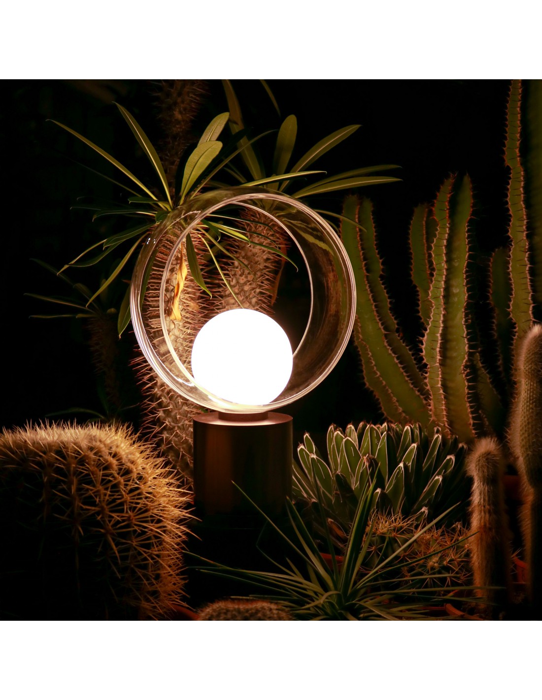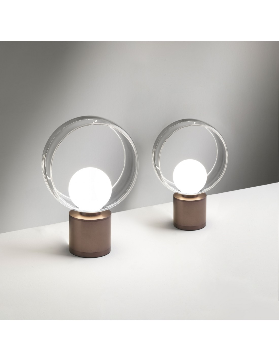 La lampada da tavolo COSMIT del marchio VIVIDA INTERNATIONAL presenta una struttura in alluminio finitura marrone ossidato, composta da base cilindrica e diffusore a sfera in vetro accerchiato da un anello decorativo.