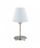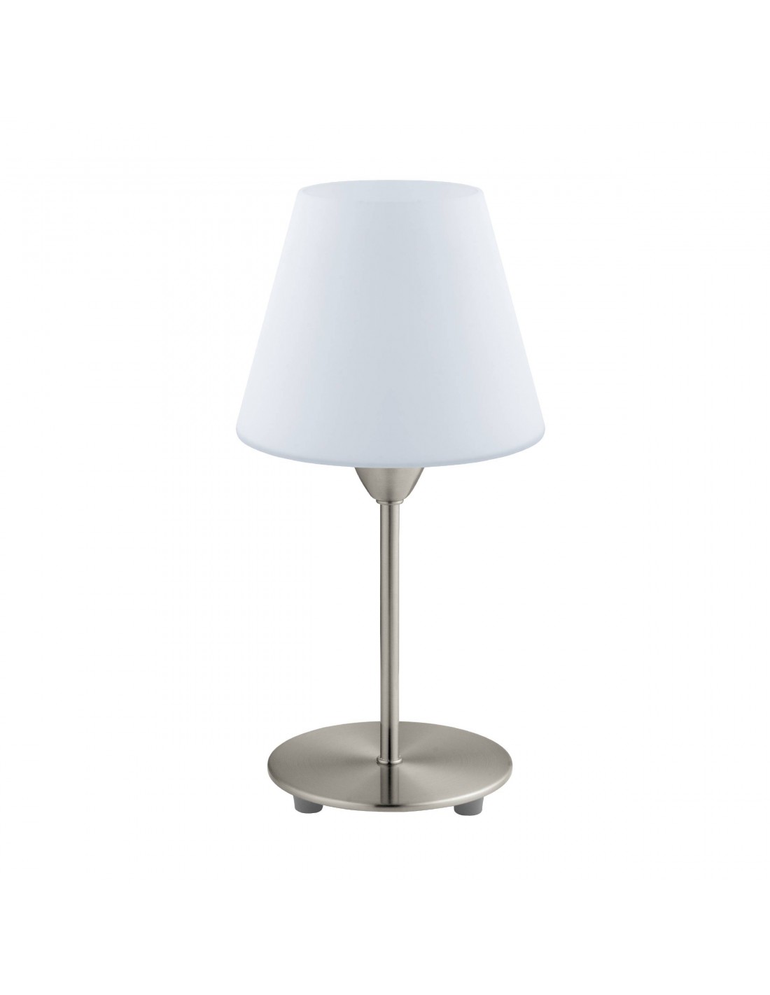 La lampada da tavolo DAMASCO del brand EGLO presenta una struttura in metallo finitura nichel satinato e diffusore in vetro opale bianco.
