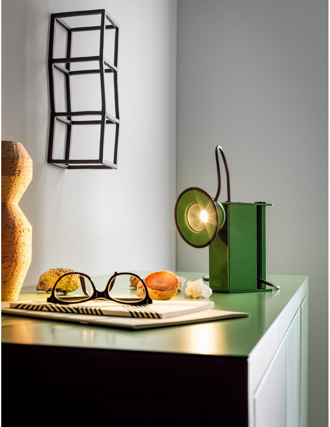 Composta da una struttura in metallo verniciato verde e un occhio luminoso con diffusore in vetro trasparente. Grazie allo snodo con aggancio magnetico la testa potrà essere orientata a piacimento in modo di indirizzare il flusso luminoso in punti specifici di interesse.
