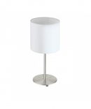 La lampada da tavolo PASTERI del brand EGLO presenta un profilo in metallo finitura nichel opaco con diffusore cilindrico in tessuto di lino colore bianco.