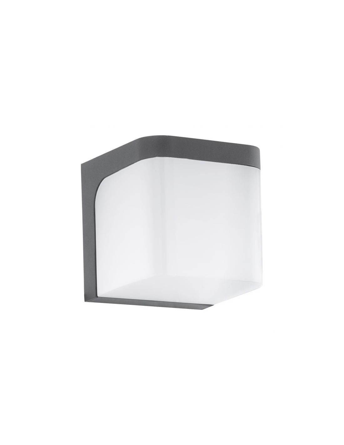 La lampada da parete JORBA del brand Eglo presenta una struttura a forma di cubo in lega di alluminio antracite e diffusore in policarbonato bianco.