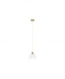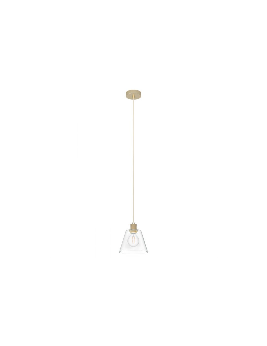 La lampada a sospensione COPLEY del brand Eglo presenta una struttura in metallo oro e paralume conico in vetro trasparente.