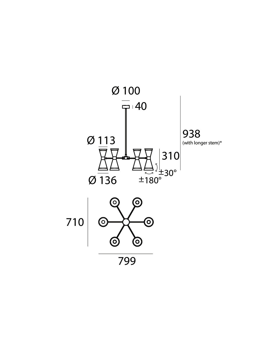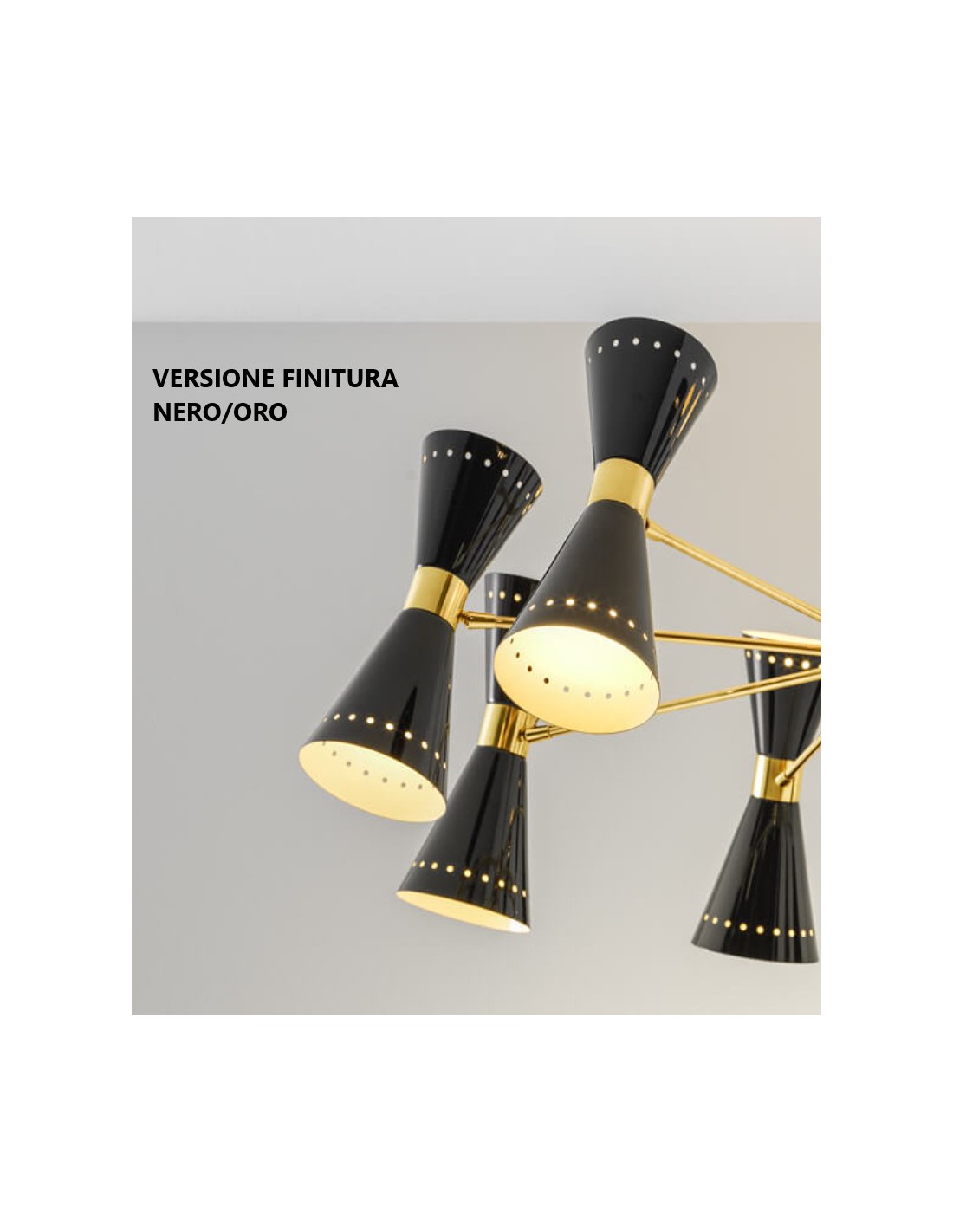 Composta da un corpo in ottone con finitura oro tramite tecnica galvanostegia, 6 bracci lineari con doppi diffusori orientabili conici in metallo verniciati oro lucido all’interno ed esternamente di colore nero.