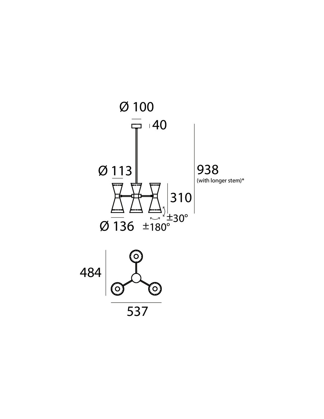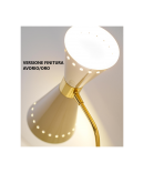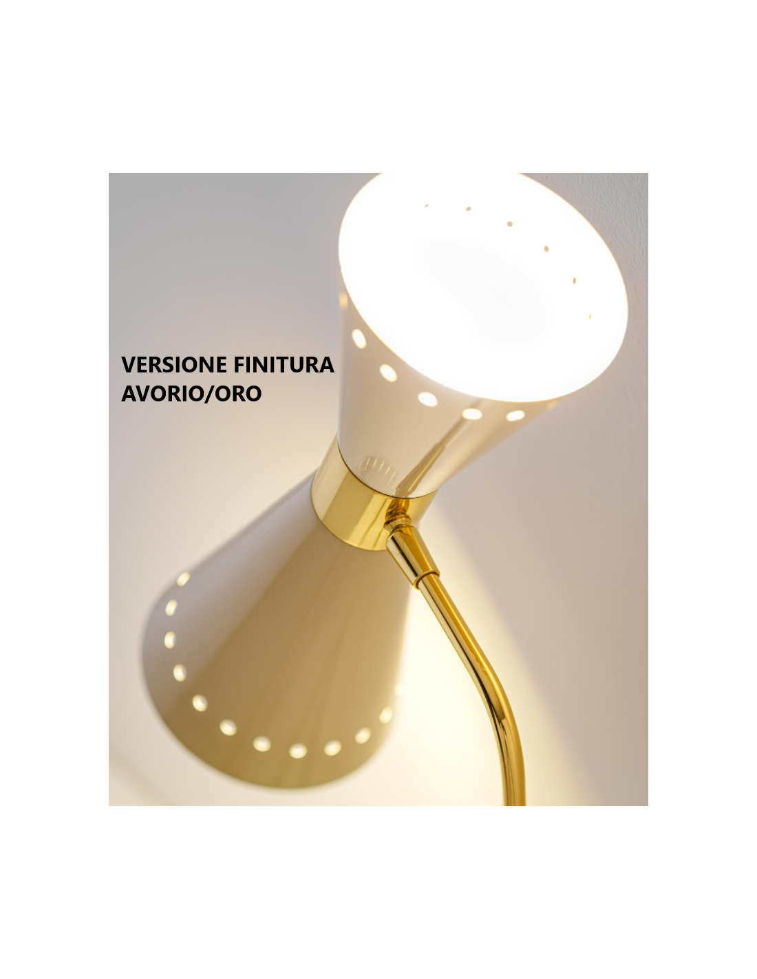 Composta da un corpo in ottone con finitura oro tramite tecnica galvanostegie, 3 bracci lineari con doppi diffusori orientabili conici in metallo verniciati oro lucido all’interno ed esternamente di colore avorio.