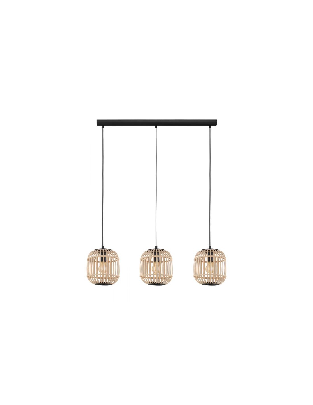 La lampada a sospensione BORDESLEY del brand EGLO è composta da una montatura in metallo nero con rosone rettangolare, cavi regolabili e 3 diffusori in legno naturale a forma di gabbia.