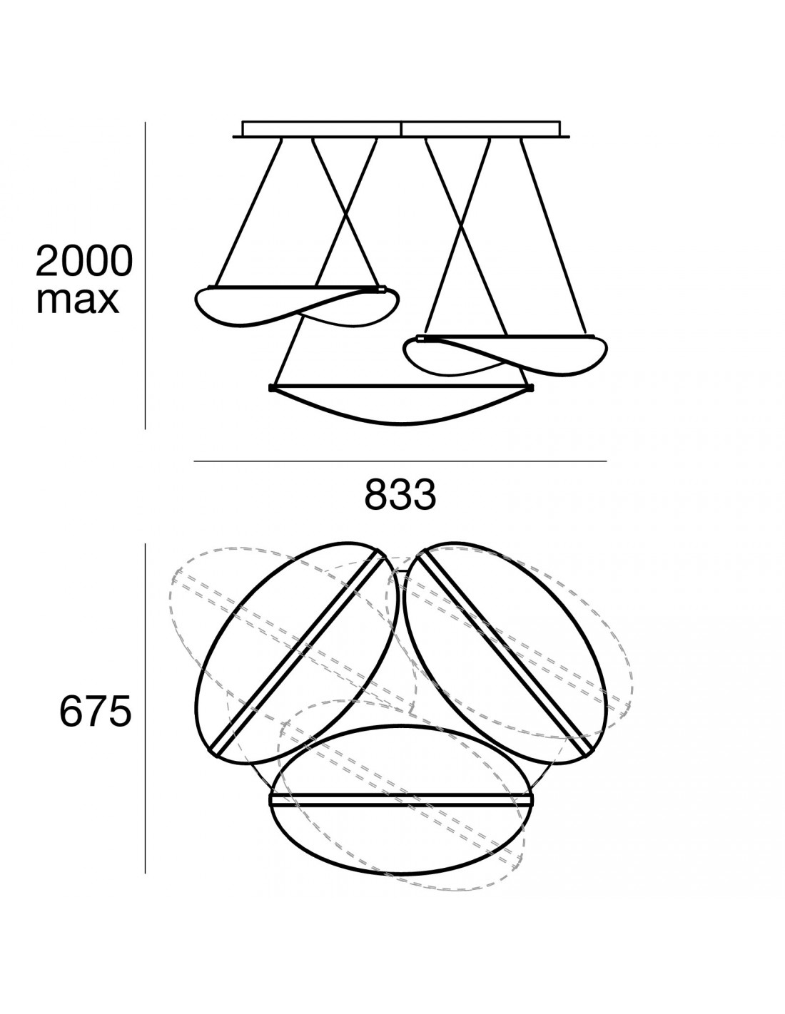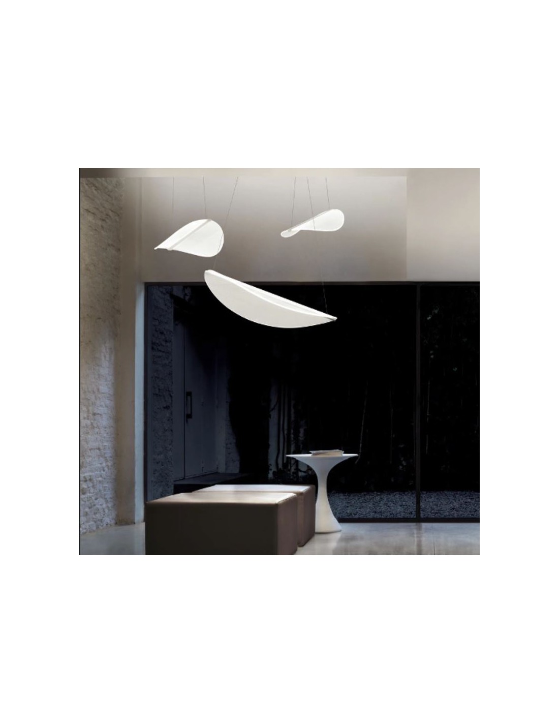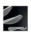 Una sospensione a luce diffusa caratterizzata da forme sottili e leggiadre, composta da una struttura rotonda in alluminio verniciato bianco, da cui pendono 3 diffusori a forma di foglia. I diffusori sono in PMMA interamente ricopertI da una trama di microincisioni a tagli laser che distribuiscono la luce nel piano sottostante e verso l’alto (OptiLight Technology TM).