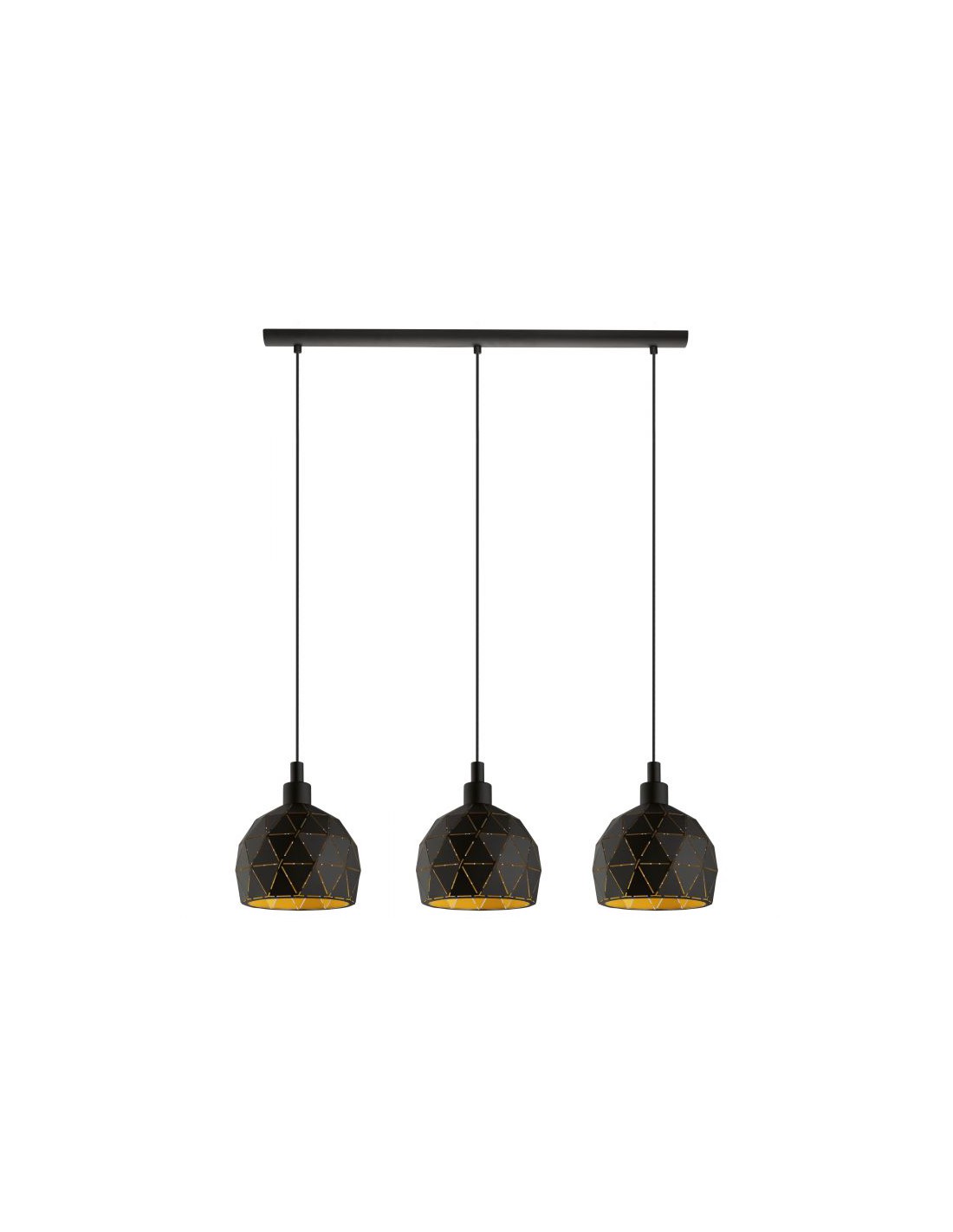 La sospensione ROCCAFORTE del brand EGLO presenta una struttura in metallo di colore nero composta da rosone lineare e 3 paralumi sfaccettati e decorati con tagli laser, interno dorato.