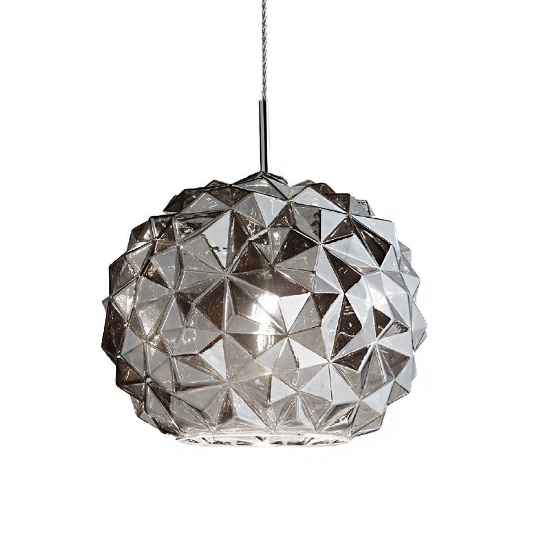 • Vetro lavorato colore fumé. Montatura in metallo con finitura cromo lucido. Emissione di luce DIFFUSA.