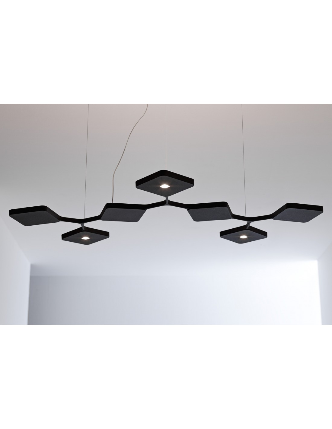 Realizzata nel 2018, QUAD_P7 è una lampada a sospensione a 7 luci con doppia emissione, caratterizzata da un design unico e inconfondibile.